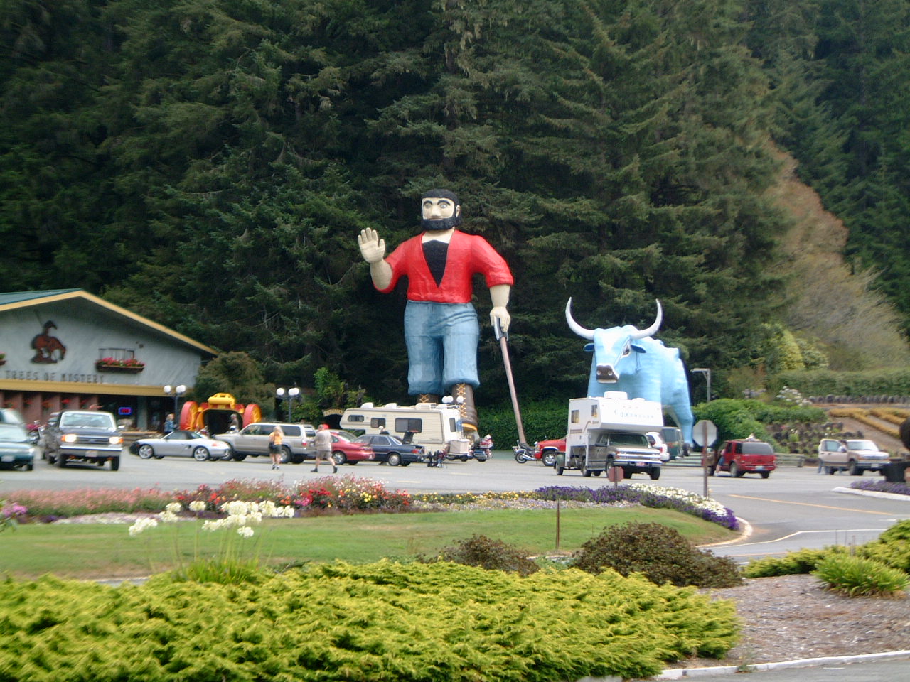 Could not find any back roads to camp on at all. Very much wanted to sleep outdoors under the redwoods but by 8pm was resigned to staying in an "AAA Approved" place called Trees Motel next to the Trees of Mystery tourist spot. First actual shower in close to 10 days otherwise an uneventful evening. Had breakfast the next morning at the Forest Café where plastic fish hanging from the ceiling is exotic.